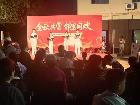 济南原香溪谷项目则上演了一场“金秋共赏 邻里同欢”双节晚会。物业团队以贴心后勤保障展现服务温度,精心设置的爆米花供应点飘散着甜蜜香气,瞬间拉近了与居民的距离。专业细致的场地布置与秩序维护,为晚会构筑了安全温馨的参与环境。开场舞点燃全场热情,萨克斯演奏流淌浪漫音符,话剧表演妙趣横生,双人舞姿雅致动人,每一个节目都凝聚着表演者的匠心,也为居民们带来了难忘的艺术享受。